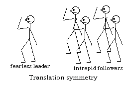 This is more difficult to follow. The leader faces towards the followers. If the leader raises her right hand, then those following also raise their right hands. This kind of symmetry is often seen in Spanish Dance, especially in duets. This symmetry involves a 180 degree rotation; other rotational symmetries aree explored in the chapter __________.
