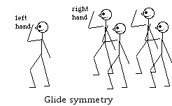 Glide symmetry is sometimes difficult for people to recognize. The leader and the class face the same direction, but move in mirror image forms. That is, if the leader raises her left hand, as in the picture, then the followers raise their right hands.