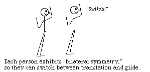 Next have the partners practice switching between translation and glide symmetries. The switch ocurs when each person's body position exhibits what is called "bilateral symmetry," with both left and right sides of the body making the same, but mirror image, shapes. The partner who is in front and leading says, "Switch," and they begin moving with the other symmetry. Can you become proficient enough to follow when the leader does not say "swithch?"